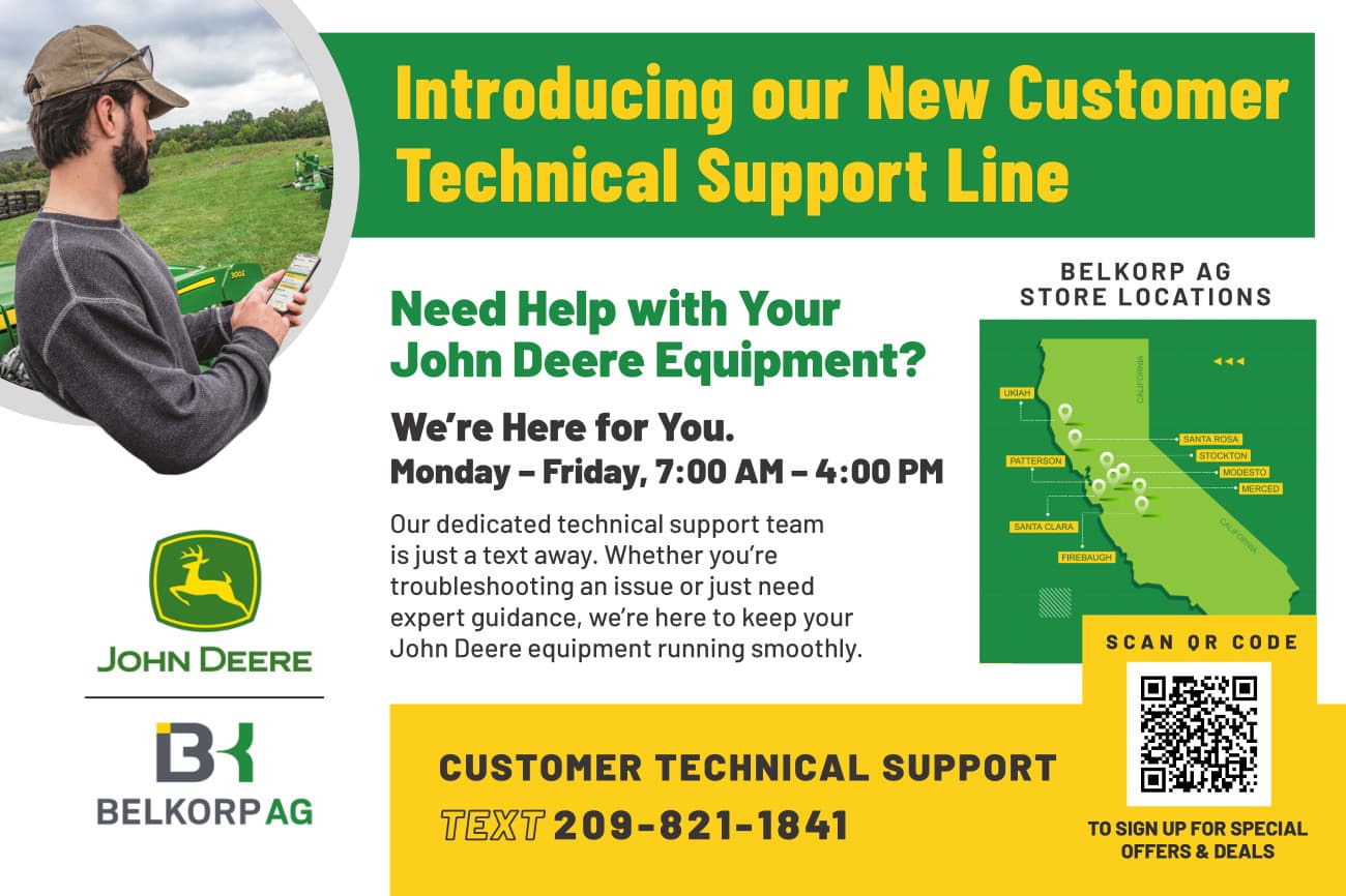 It’s easy! Just text 209-821-1841 with your issue, and one of our experienced service technicians will get back to you soon. You can text us Monday through Friday, 7 a.m. to 4 p.m., for immediate assistance with your John Deere or other machine’s issues.
