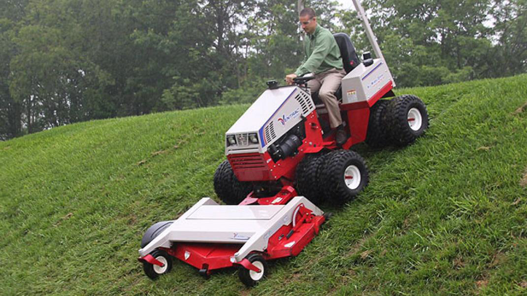 This same innovative approach also makes the Ventrac tractors unmatched in mowing on steep hillsides. With a standard setup, the Ventrac can already handle slopes on a 36% grade. With wheel extensions you can take that to a 47% grade and if you need to take it even further, you can opt for the dual wheels. This remarkable build can handle mowing on slopes up to a 58% grade. Dual wheels also offer a number of other benefits, such as increased traction and thus improved towing and pushing power.